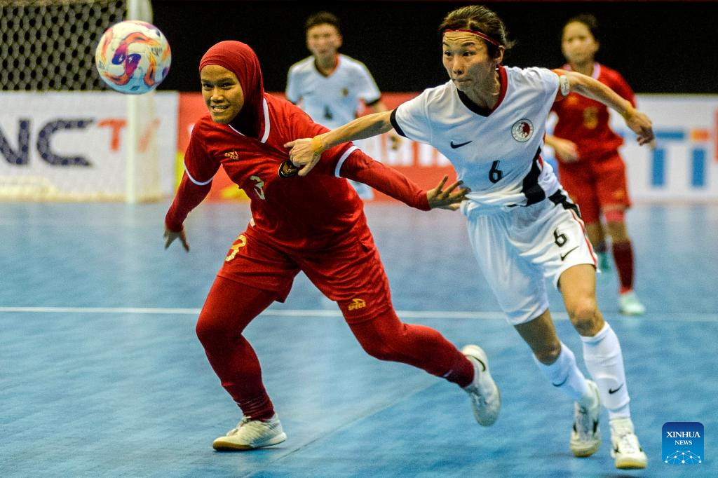Chan Wing Sze (R) of China's Hong Kong vies with Insyafadya Salsabillah of Indonesia during the Asian Football Confederation (AFC) Women Futsal Asian Cup 2025 qualifiers Group B match at Among Rogo Sports Hall in Yogyakarta, Indonesia, Jan. 19, 2025. (Photo by Agung Supriyanto/Xinhua)
