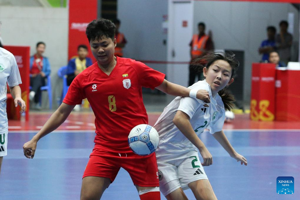 Nang Seng Brim (L) of Myanmar vies against Chan Ka Kei of China's Macau during the AFC Women's Futsal Asian Cup 2025 qualification Group D Match in Yangon, Myanmar, Jan. 19, 2025. (Xinhua/Myo Kyaw Soe)