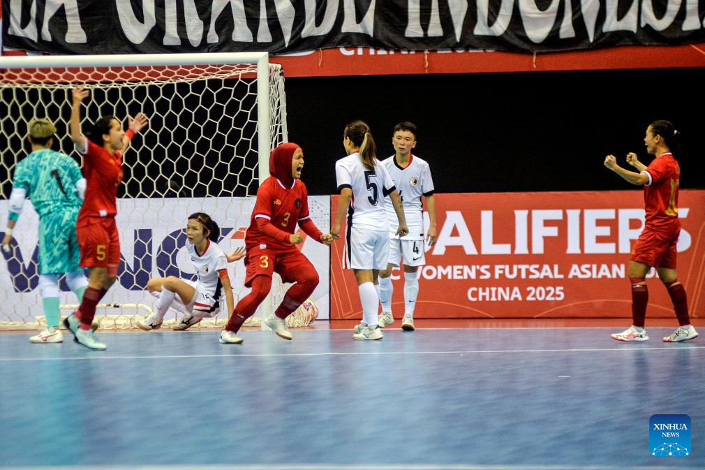 Players of team Indonesia celebrate after scoring during the Asian Football Confederation (AFC) Women Futsal Asian Cup 2025 qualifiers Group B match between Indonesia and China's Hong Kong at Among Rogo Sports Hall in Yogyakarta, Indonesia, Jan. 19, 2025. (Photo by Agung Supriyanto/Xinhua)