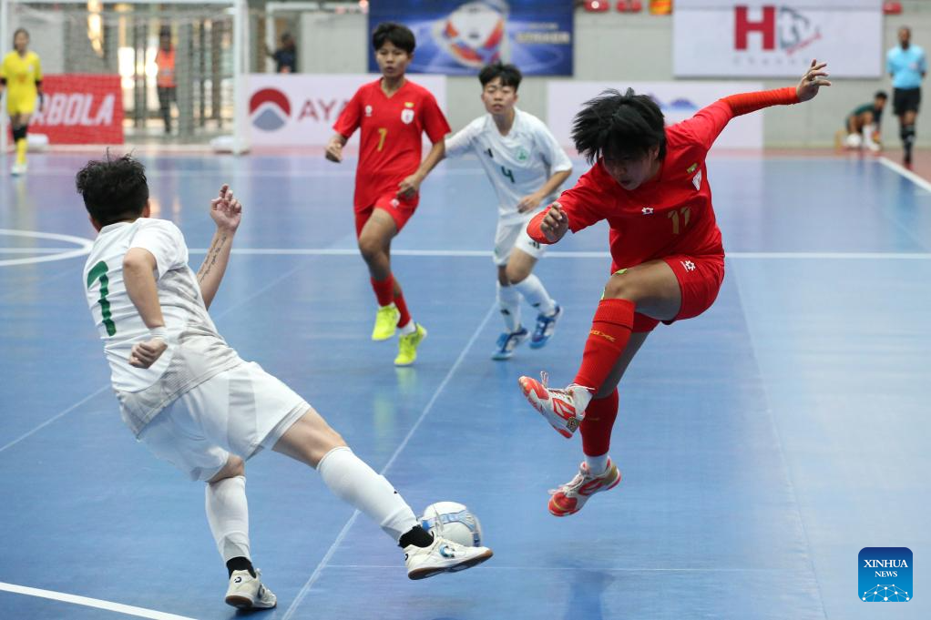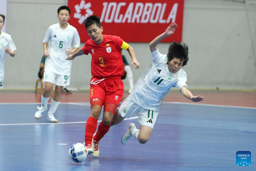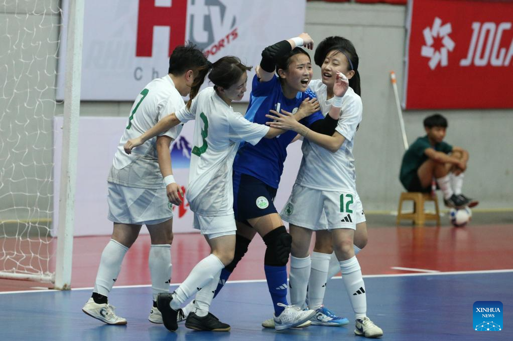Players of China's Macau celebrate after scoring during the AFC Women's Futsal Asian Cup 2025 qualification Group D Match between China's Macau and Myanmar in Yangon, Myanmar, Jan. 19, 2025. (Xinhua/Myo Kyaw Soe)