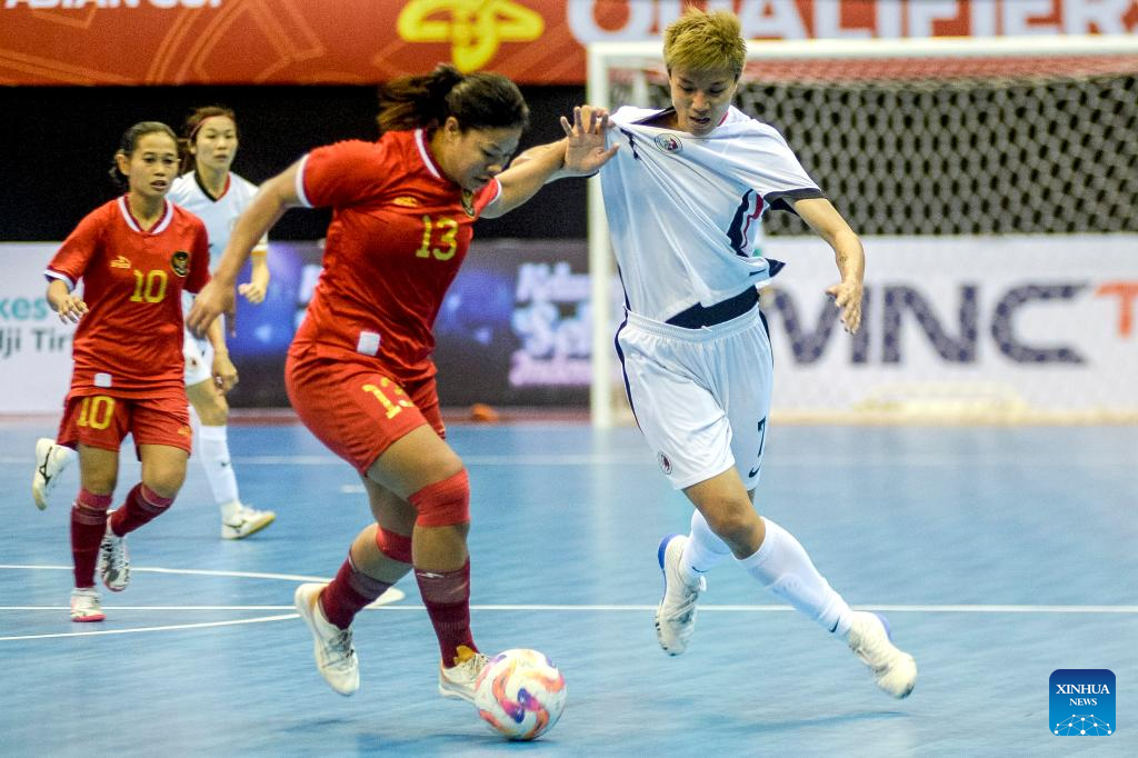 Cheung Wai Ki (R) of China's Hong Kong vies with Ikeu Rosita of Indonesia during the Asian Football Confederation (AFC) Women Futsal Asian Cup 2025 qualifiers Group B match at Among Rogo Sports Hall in Yogyakarta, Indonesia, Jan. 19, 2025. (Photo by Agung Supriyanto/Xinhua)