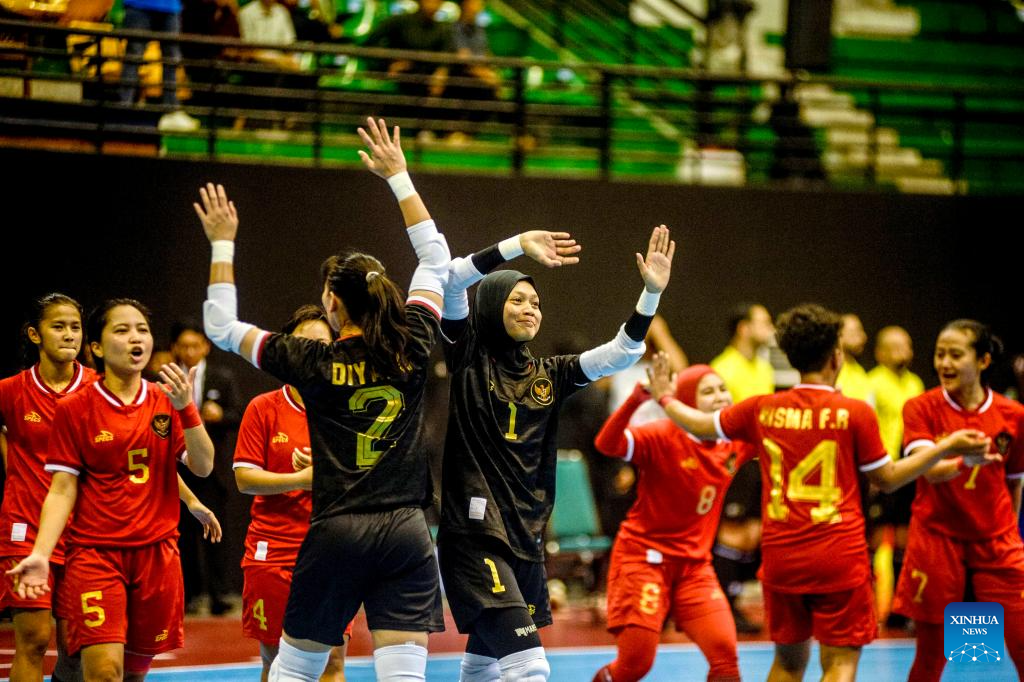 Players of team Indonesia celebrate after the Asian Football Confederation (AFC) Women Futsal Asian Cup 2025 qualifiers Group B match between Indonesia and China's Hong Kong at Among Rogo Sports Hall in Yogyakarta, Indonesia, Jan. 19, 2025. (Photo by Agung Supriyanto/Xinhua)