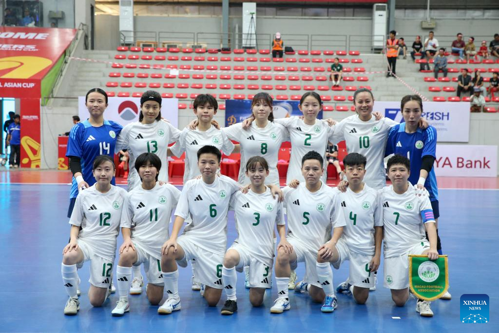 Starting players of China's Macau pose for a group photo prior to the AFC Women's Futsal Asian Cup 2025 qualification Group D Match between China's Macau and Myanmar in Yangon, Myanmar, Jan. 19, 2025. (Xinhua/Myo Kyaw Soe)