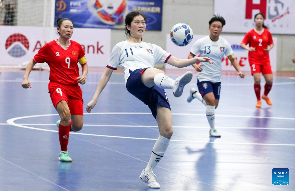 Chen Min-Huang (C) of Chinese Taipei controls the ball during the AFC Women's Futsal Asian Cup 2025 qualification Group D match between Vietnam and Chinese Taipei in Yangon, Myanmar, Jan. 19, 2025. (Xinhua/Myo Kyaw Soe)