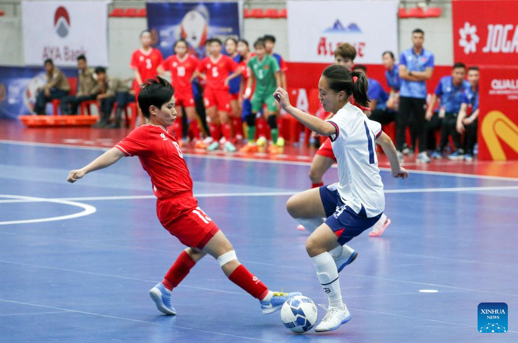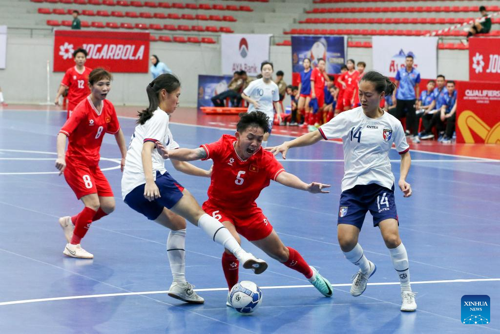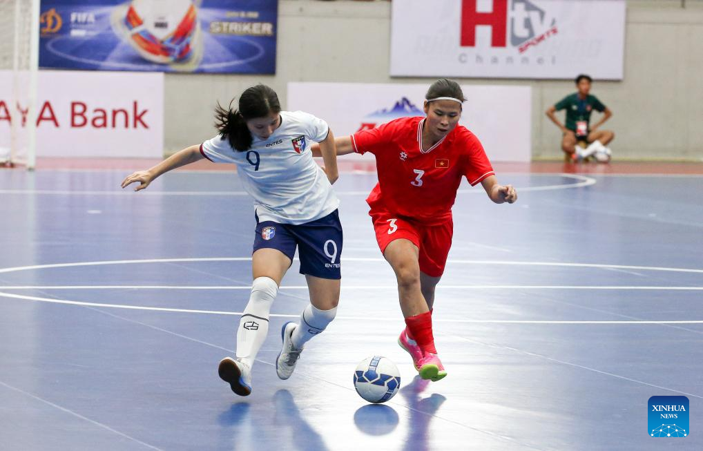 Tran Nguyet Vi (2nd R) of Vietnam vies for the ball during the AFC Women's Futsal Asian Cup 2025 qualification Group D match between Vietnam and Chinese Taipei in Yangon, Myanmar, Jan. 19, 2025. (Xinhua/Myo Kyaw Soe)