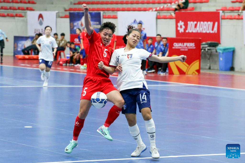 Ho Chia-Chen (L) of Chinese Taipei vies for the ball during the AFC Women's Futsal Asian Cup 2025 qualification Group D match between Vietnam and Chinese Taipei in Yangon, Myanmar, Jan. 19, 2025. (Xinhua/Myo Kyaw Soe)