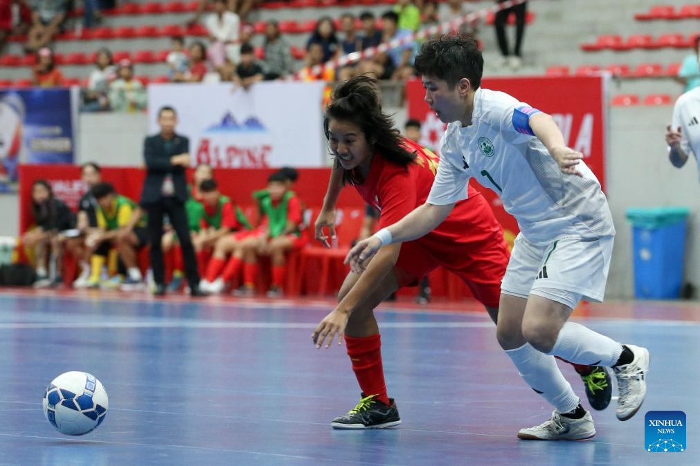 Bui Thi Trang (L) of Vietnam vies against Jheng Ya-Zih of Chinese Taipei during the AFC Women's Futsal Asian Cup 2025 qualification Group D match between Vietnam and Chinese Taipei in Yangon, Myanmar, Jan. 19, 2025. (Xinhua/Myo Kyaw Soe)