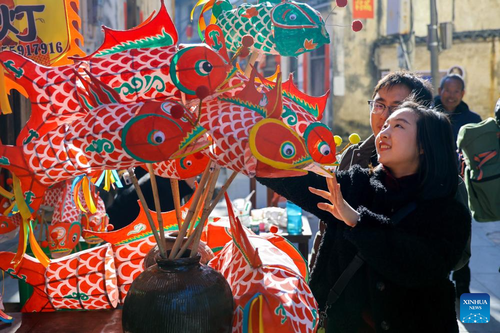 Tourists select fish-shaped lanterns at Zhanqi Village in Shexian County of Huangshan City, east China's Anhui Province, Jan. 18, 2025.