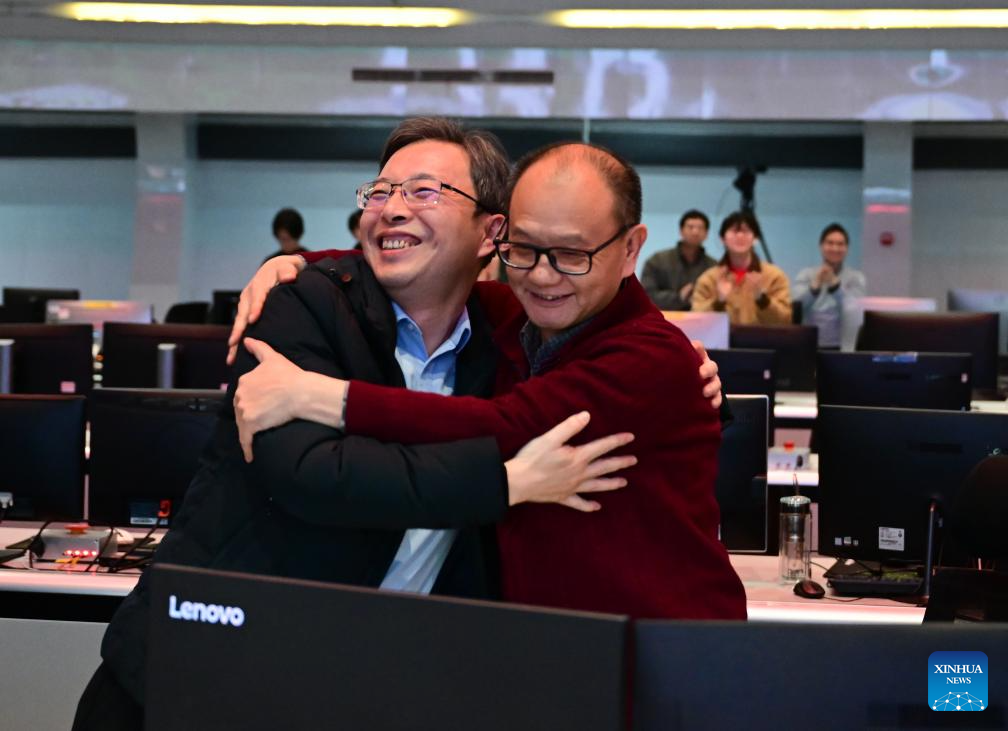 Gong Xianzu (R), head of division of the Experimental Advanced Superconducting Tokamak (EAST) Physics and Experimental Operations, and Lu Kun, deputy director of Institute of Plasma Physics of the Chinese Academy of Sciences (ASIPP), celebrate in Hefei, east China's Anhui Province, Jan. 20, 2025.