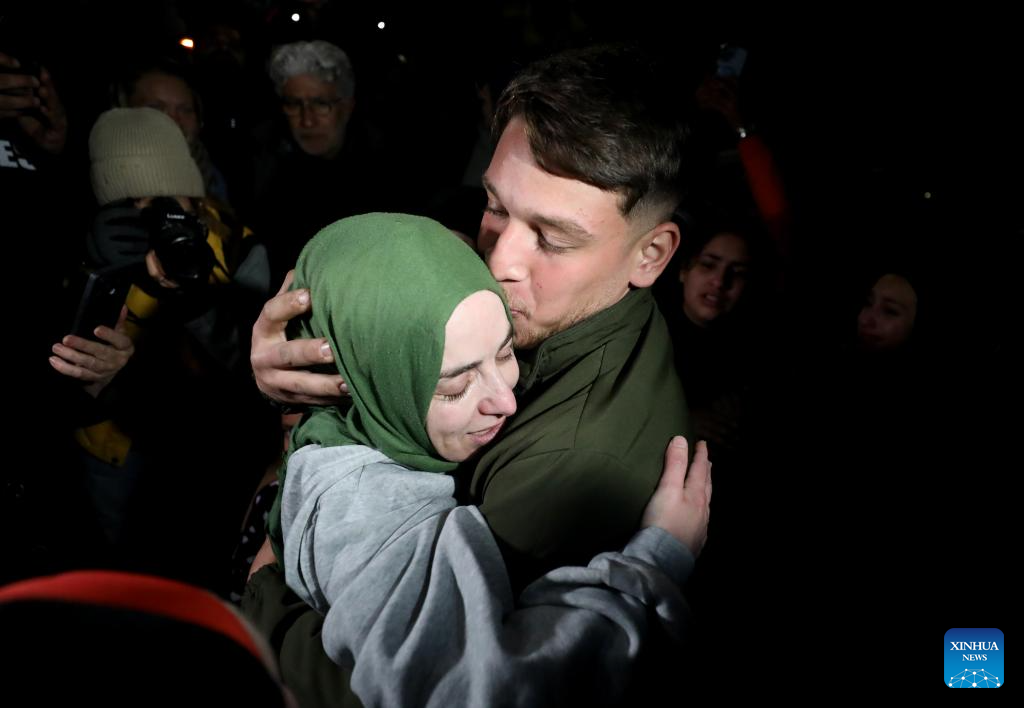 Israel released 90 Palestinian prisoners from Ofer prison, located west of Ramallah in the West Bank, early on Monday, just hours after three Israeli hostages returned to Israel following their release from Hamas captivity in Gaza. (Photo by Ayman Nobani/Xinhua)