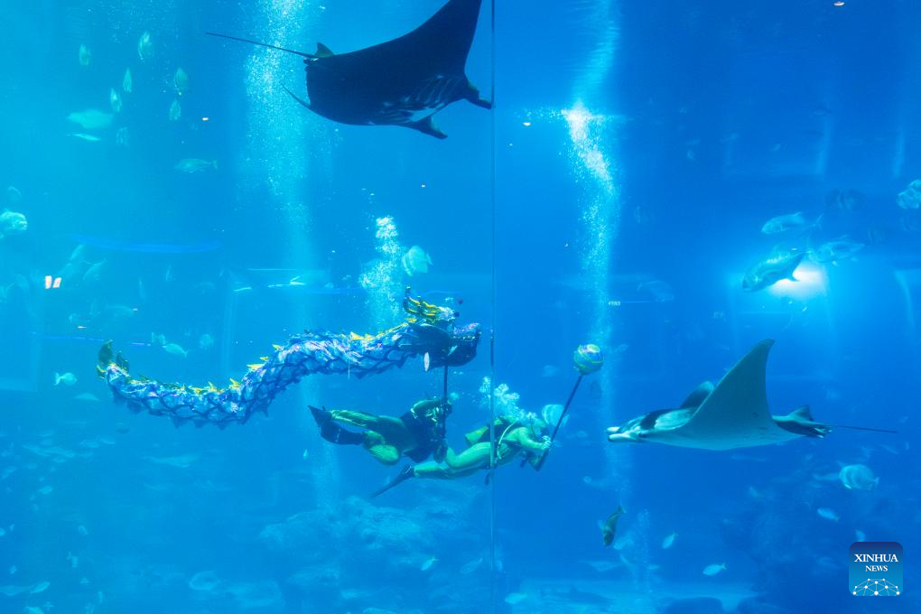 Divers perform underwater dragon dance in celebration of the upcoming Chinese Lunar New Year at the S.E.A. Aquarium in Singapore, Jan. 20, 2025. (Photo by Then Chih Wey/Xinhua)