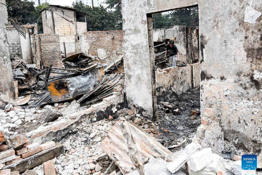 A man collects usable items near damaged houses after a fire in Kemayoran sub-district of Central Jakarta, Indonesia, Jan. 21, 2025. More than 600 families in the Indonesian city of Jakarta were forced to evacuate after a blaze destroyed over 500 houses in Kemayoran sub-district of Central Jakarta early Tuesday, city officials said. (Xinhua/Agung Kuncahya B.)