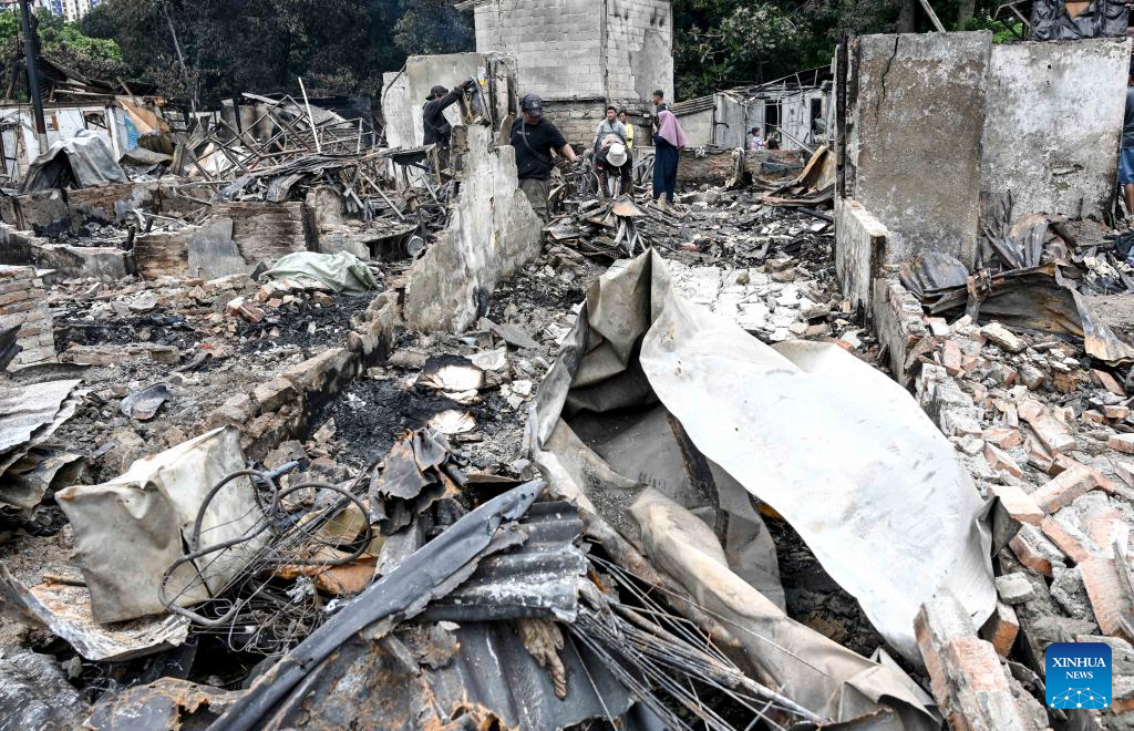 People collect usable items near damaged houses after a fire in Kemayoran sub-district of Central Jakarta, Indonesia, Jan. 21, 2025. More than 600 families in the Indonesian city of Jakarta were forced to evacuate after a blaze destroyed over 500 houses in Kemayoran sub-district of Central Jakarta early Tuesday, city officials said. (Xinhua/Agung Kuncahya B.)