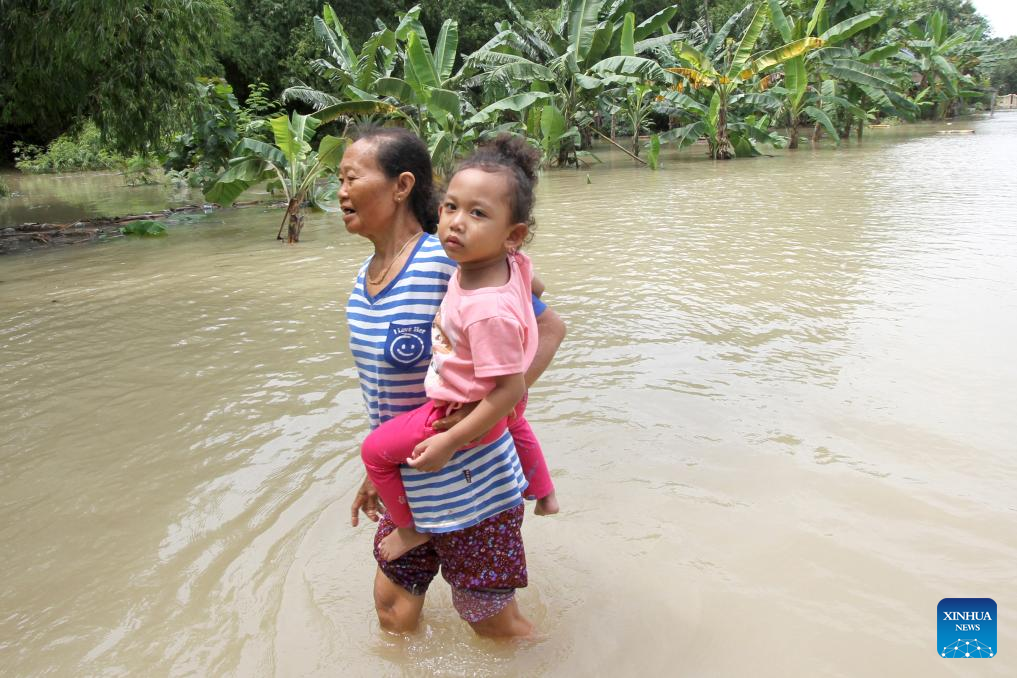 A woman holding her kid walks through floodwater in Sragen Regency, Central Java, Indonesia, Jan. 21, 2025. Flash floods and landslides in Pekalongan Regency, located in Central Java province, have killed at least 16 people, with three individuals still missing and 10 others injured, Indonesia's National Disaster Management Agency (BNPB) said on Tuesday. Fadia Arafiq, regent of Pekalongan, said that although several sub-districts experienced similar events, Petungkriono was the hardest hit. (Photo by Bram Selo/Xinhua)