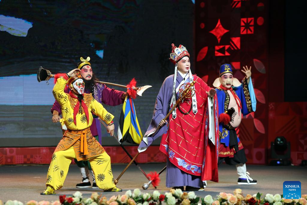During the event, artists from the Zhejiang Wu Opera Research Institute delivered stunning performances of Wu Opera classics such as "The Celestial Maiden Scattering Flowers" and "Monkey King Fights the White Bone Demon." (Photo by Habibur Rahman/Xinhua)