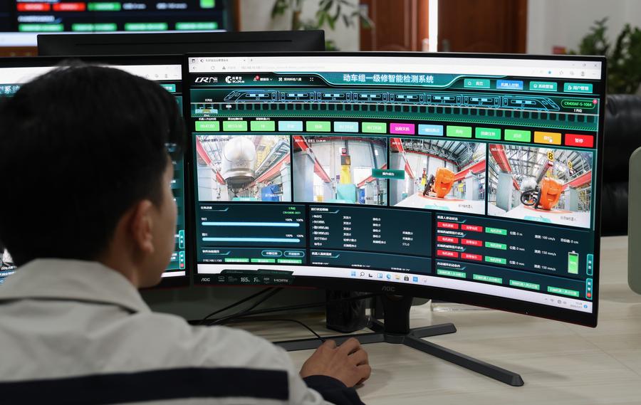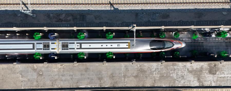 An automatic car washing system operates at a high-speed train depot in Shenzhen, south China's Guangdong Province, Jan. 17, 2025. (Xinhua/Mao Siqian)A high-speed sleeper train drives into a high-speed train depot in Shenzhen, south China's Guangdong Province, Jan. 17, 2025. (Xinhua/Mao Siqian)A maintenance staff inspects the cab of a high-speed sleeper train at a high-speed train depot in Shenzhen, south China's Guangdong Province, Jan. 17, 2025.(Xinhua/Mao Siqian)A maintenance staff inspects a high-speed sleeper train remotely with an intelligent car bottom robot at a high-speed train depot in Shenzhen, south China's Guangdong Province, Jan. 17, 2025. (Xinhua/Mao Siqian)A maintenance staff inspects a high-speed sleeper train at a high-speed train depot in Shenzhen, south China's Guangdong Province, Jan. 17, 2025. (Xinhua/Mao Siqian)The maintenance personnel review the suspected fault location detected by the intelligent car-bottom robot during the maintenance of a high-speed sleeper train at a high-speed train depot in Shenzhen, south China's Guangdong Province, Jan. 17, 2025. (Xinhua/Mao Siqian)■