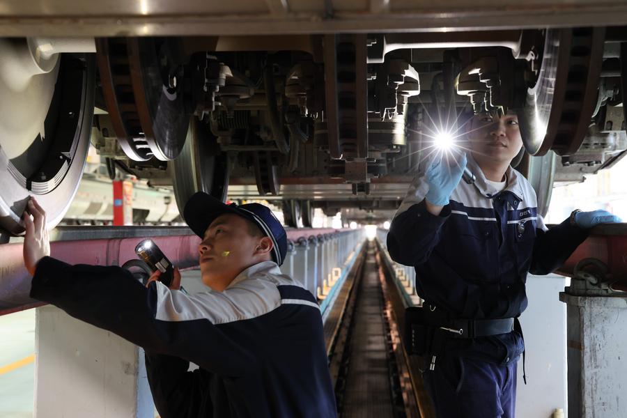 SHENZHEN, Jan. 22 (Xinhua) -- During the Spring Festival travel rush, intelligent car-bottom robots, self-service car washes, and intelligent tool rooms are used to maintain high-speed sleeper trains at a high-speed train depot in Shenzhen, south China's Guangdong Province.