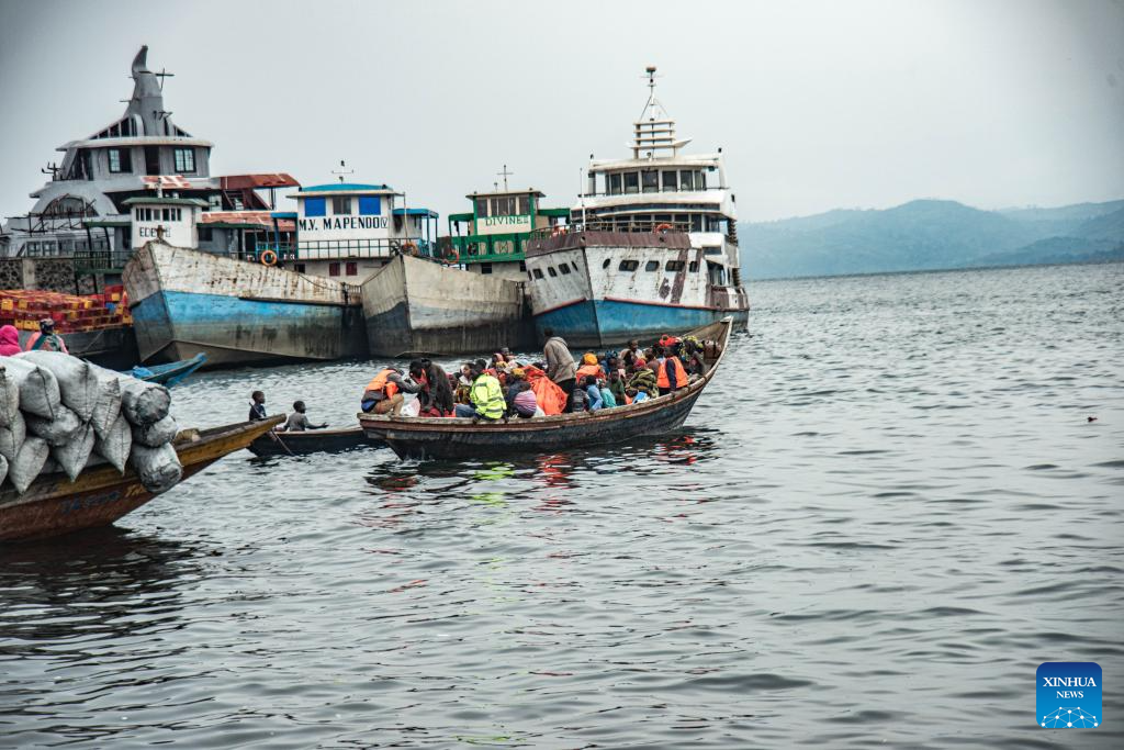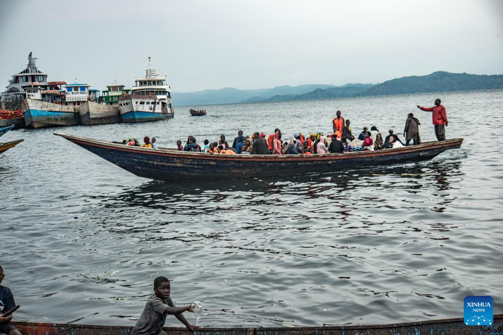 Displaced people are seen on canoes at the Nzulo port, near Goma, North Kivu province, eastern Democratic Republic of the Congo (DRC), on Jan. 23, 2025. The situation in the eastern DRC has deteriorated significantly, marked by escalating conflicts involving various armed groups, notably the M23 and the Allied Democratic Forces.