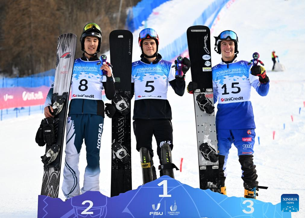 Gold medalist Tervel Zamfirov (C) of Bulgaria, silver medalist Ma Junho (L) of South Korea, bronze medalist Fabian Lantschner of Italy pose for photos during the mascot ceremony for the men's snowboard parallel giant slalom competition at the 2025 FISU Winter World University Games in Bardonecchia, Italy, Jan. 21, 2025. (Xinhua/He Canling)