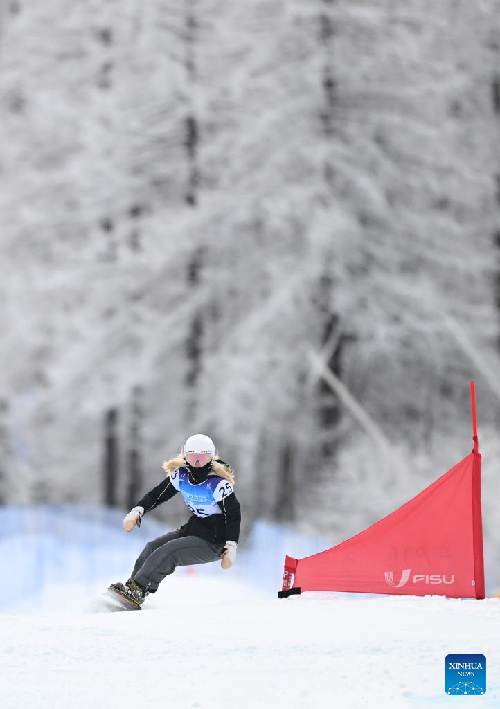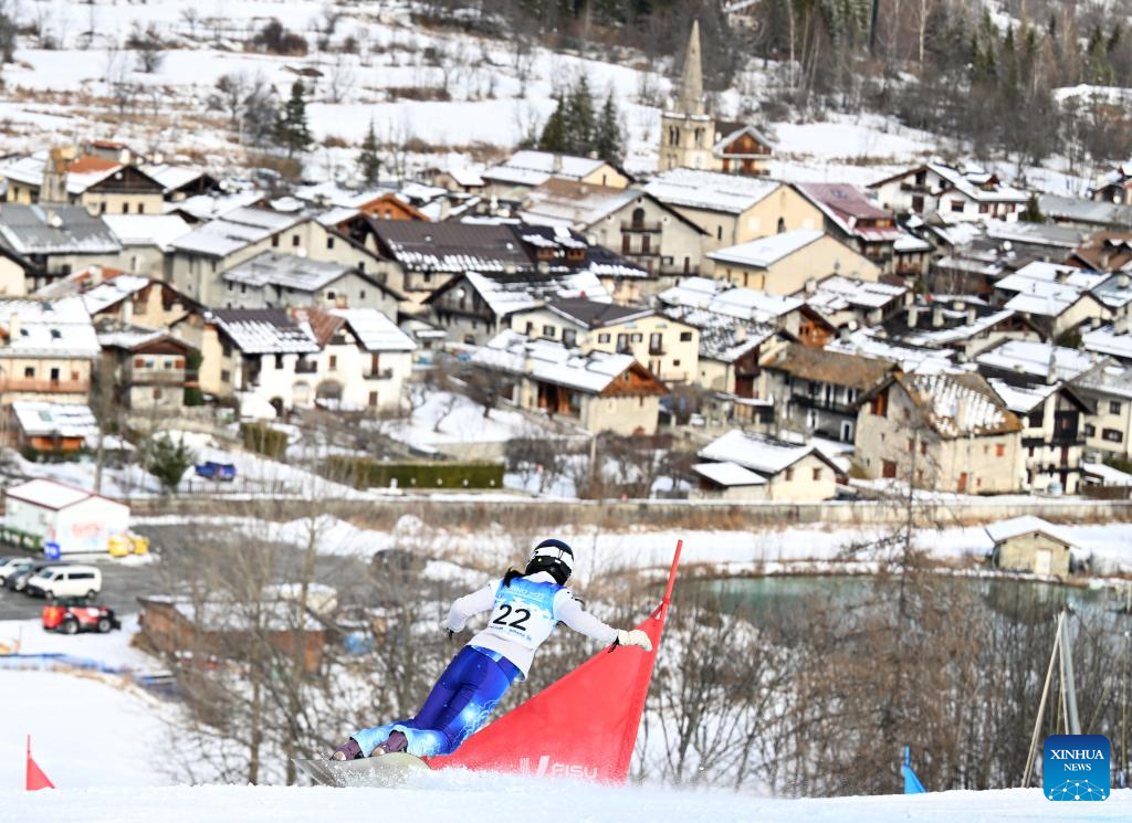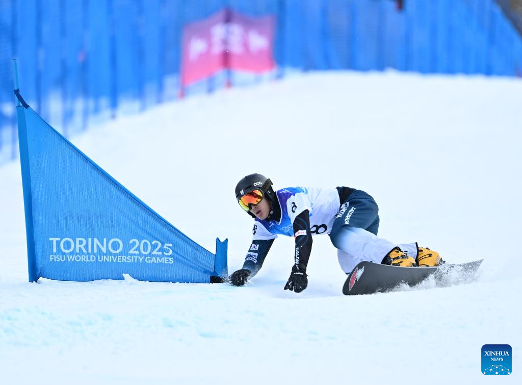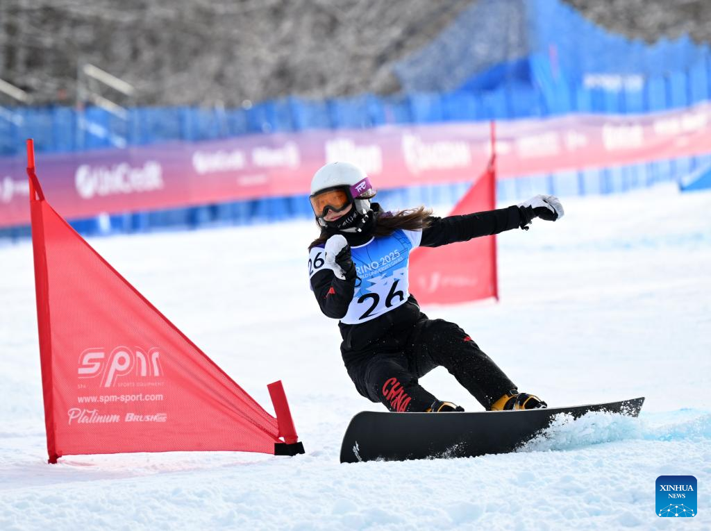 Zou Yutong of China competes during the elimination run of the women's snowboard parallel giant slalom competition at the 2025 FISU Winter World University Games in Bardonecchia, Italy, Jan. 21, 2025. (Xinhua/He Canling)