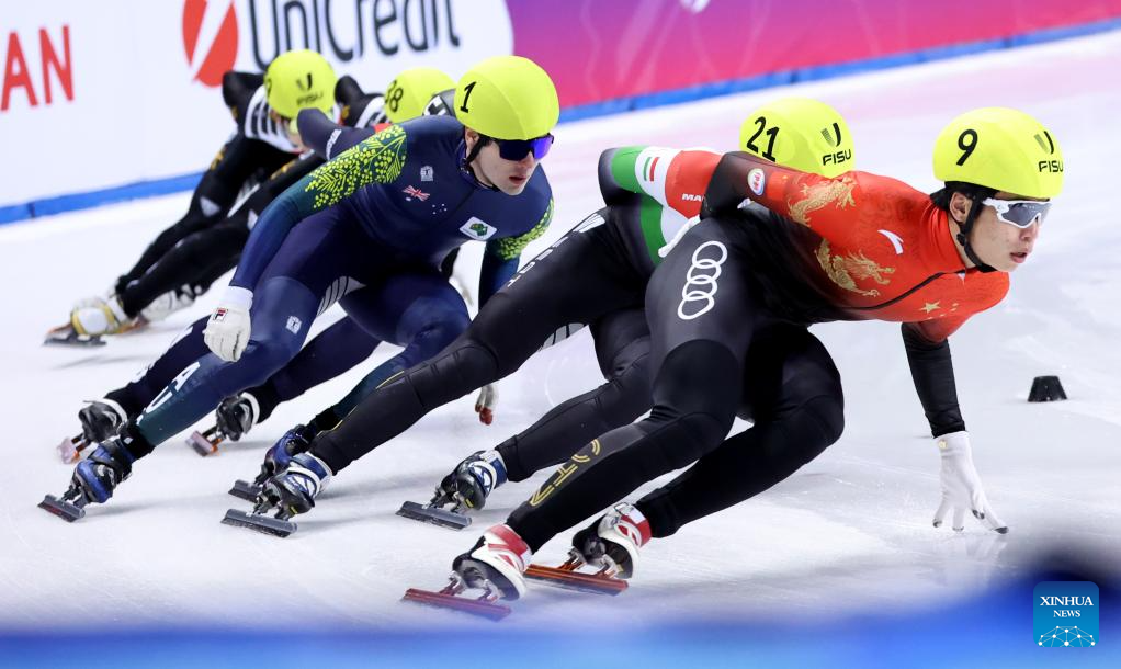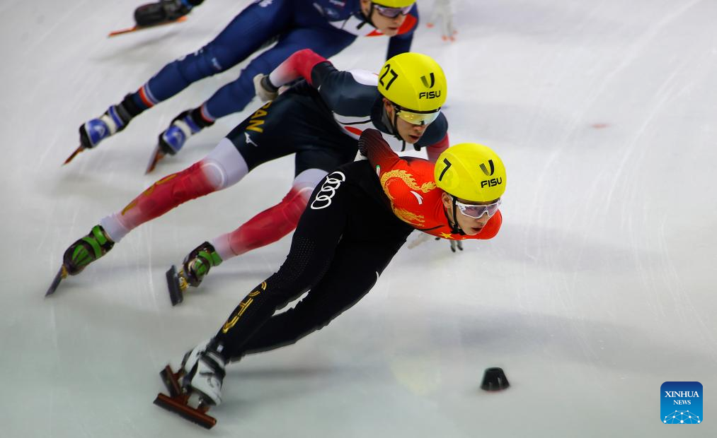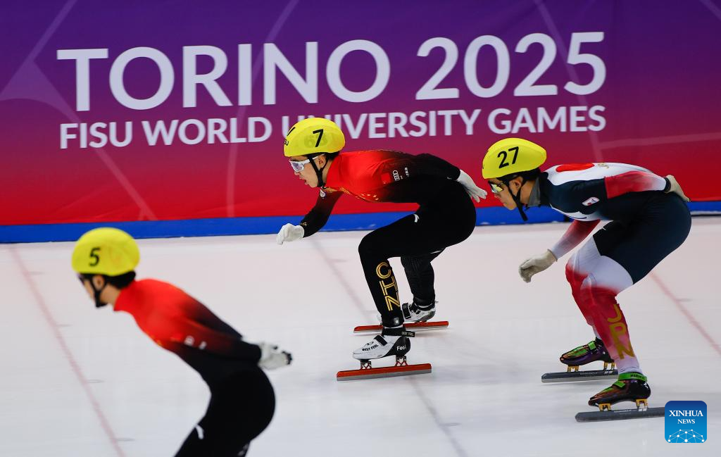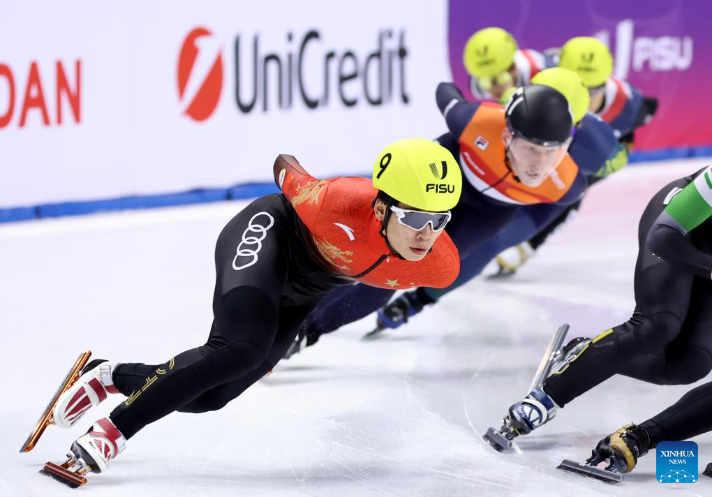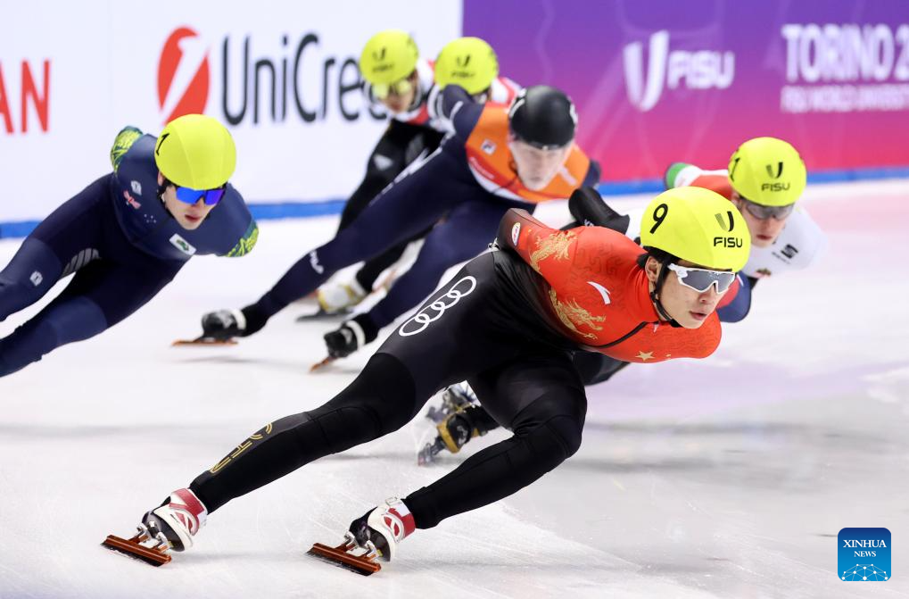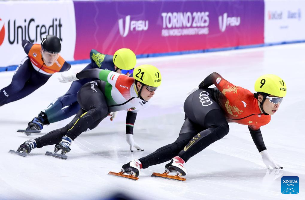 Zhu Yiding (Front) of China competes during the men's 1500m final A of the short track speed skating competition at the Torino 2025 FISU World University Winter Games in Turin, Italy, Jan. 21, 2025. (Xinhua/Zhang Chen)