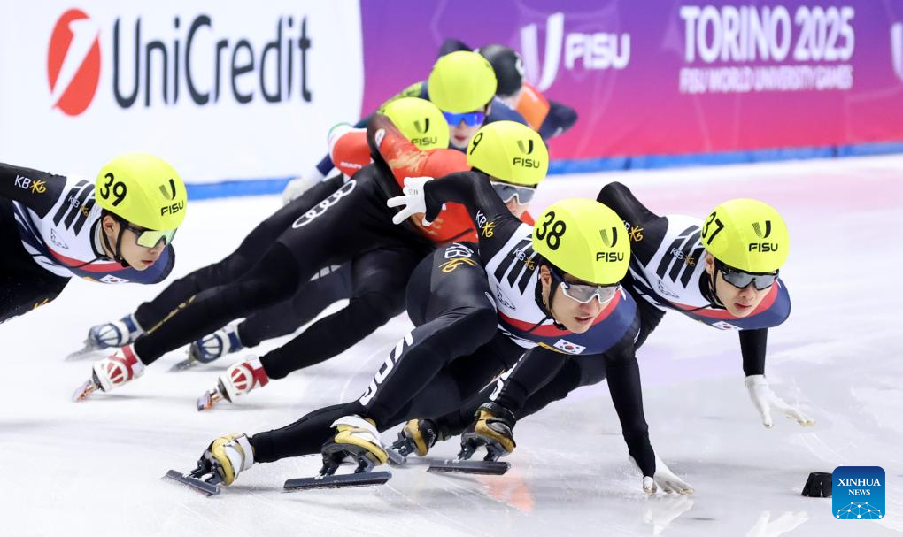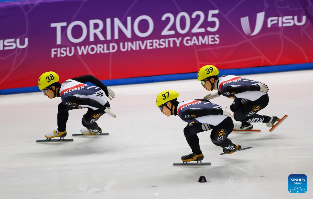 Kim Taesung (2nd R) of South Korea competes during the men's 1500m final A of the short track speed skating competition at the Torino 2025 FISU World University Winter Games in Turin, Italy, Jan. 21, 2025. (Xinhua/Zhang Chen)