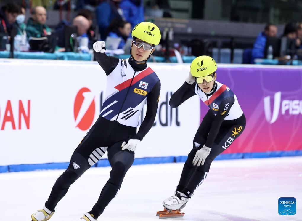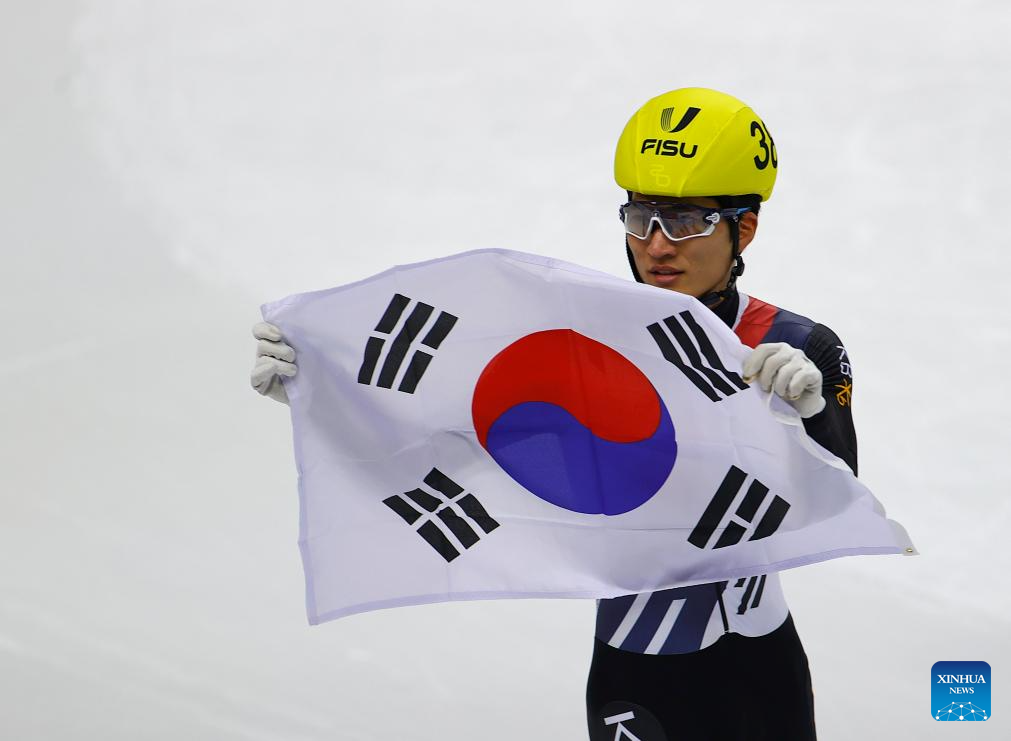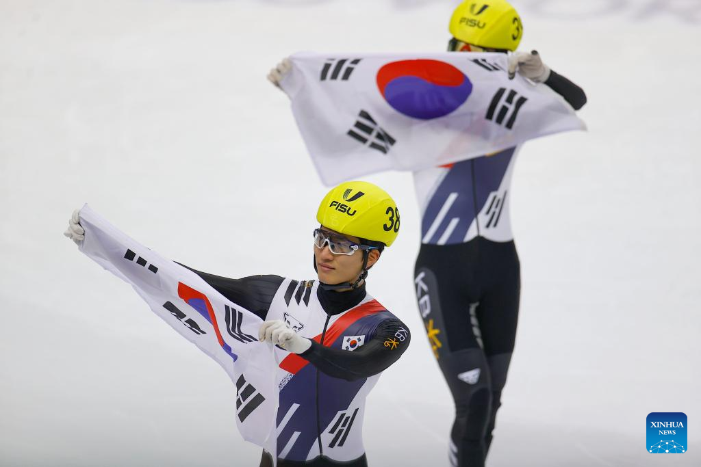 Kim Taesung (L) of South Korea celebrates after winning the men's 1500m final A of the short track speed skating competition at the Torino 2025 FISU World University Winter Games in Turin, Italy, Jan. 21, 2025. (Xinhua/Zhang Chen)