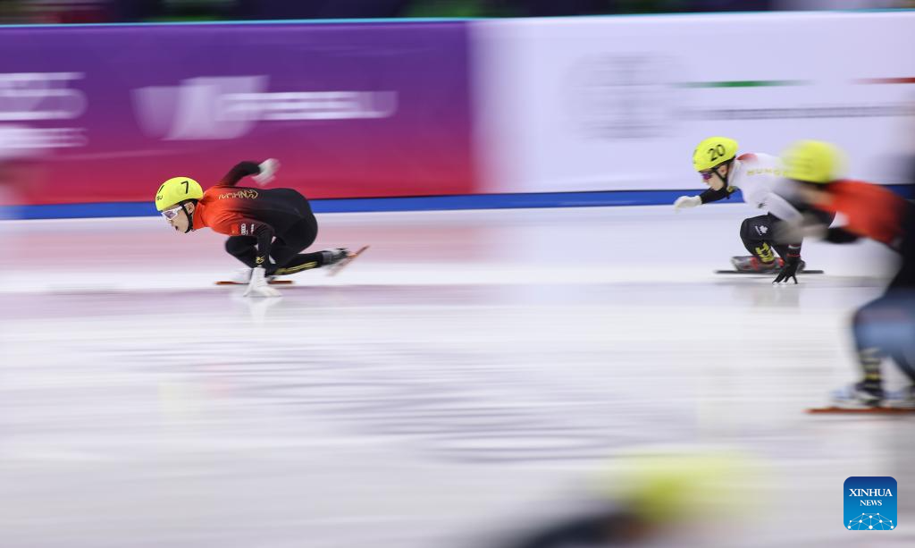 Zhang Yan (1st L) of China competes during the women's 1500m final A of the short track speed skating competition at the Torino 2025 FISU World University Winter Games in Turin, Italy, Jan. 21, 2025. (Xinhua/Zhang Chen)