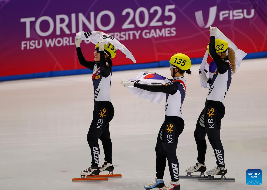 Kim Gilli, Seo Whimin and Kim Geonhee (from L to R) of South Korea celebrate after winning the women's 1500m final A of the short track speed skating competition at the Torino 2025 FISU World University Winter Games in Turin, Italy, Jan. 21, 2025. (Xinhua/Ding Xu)