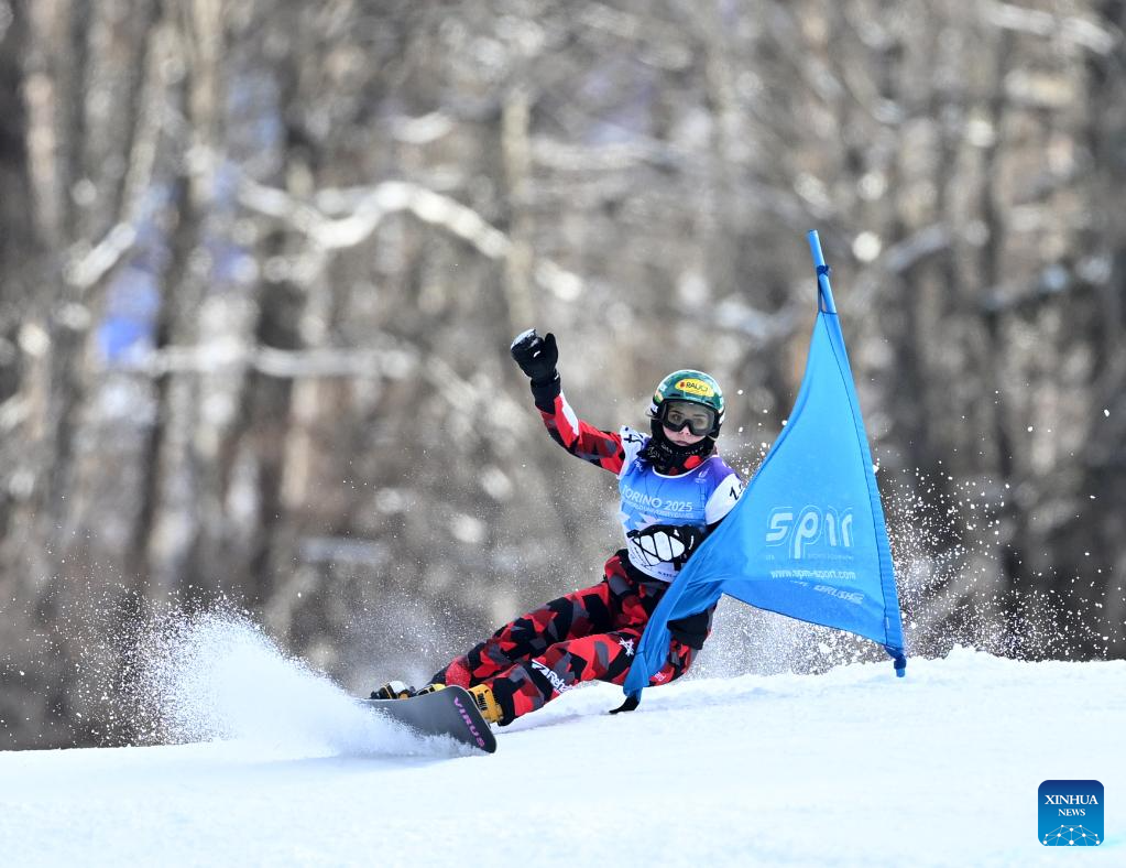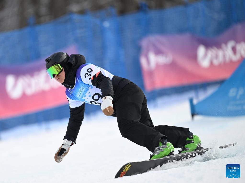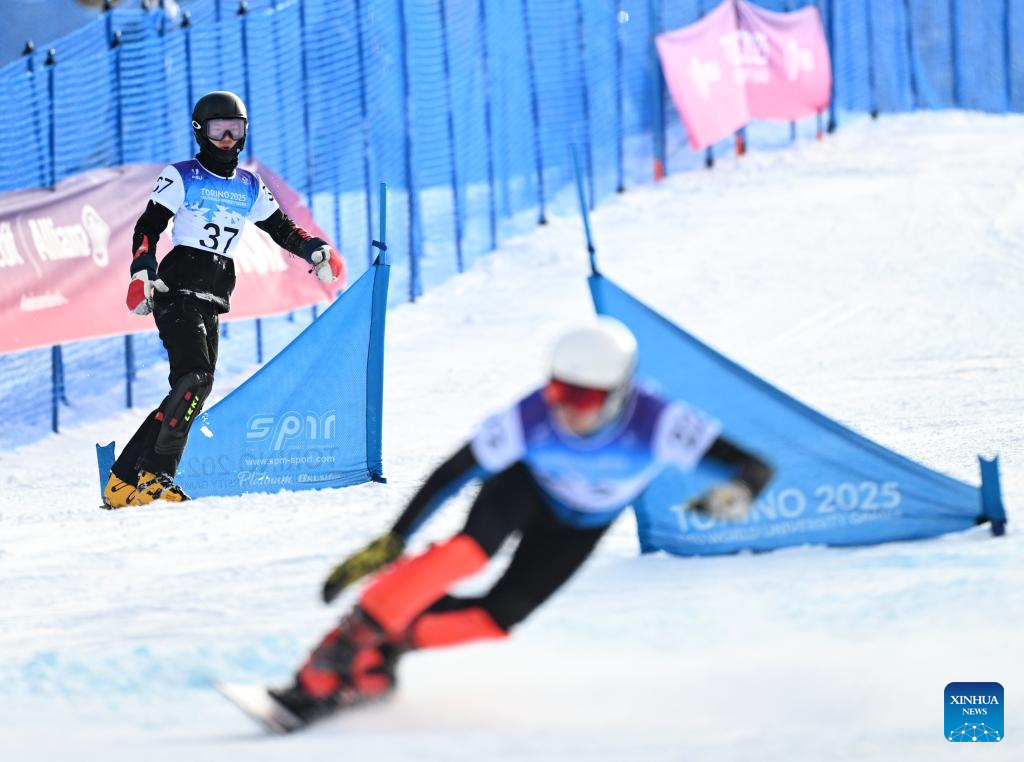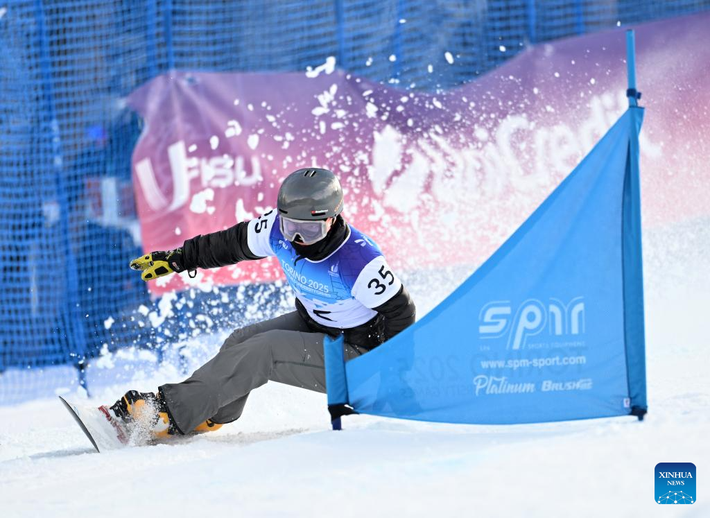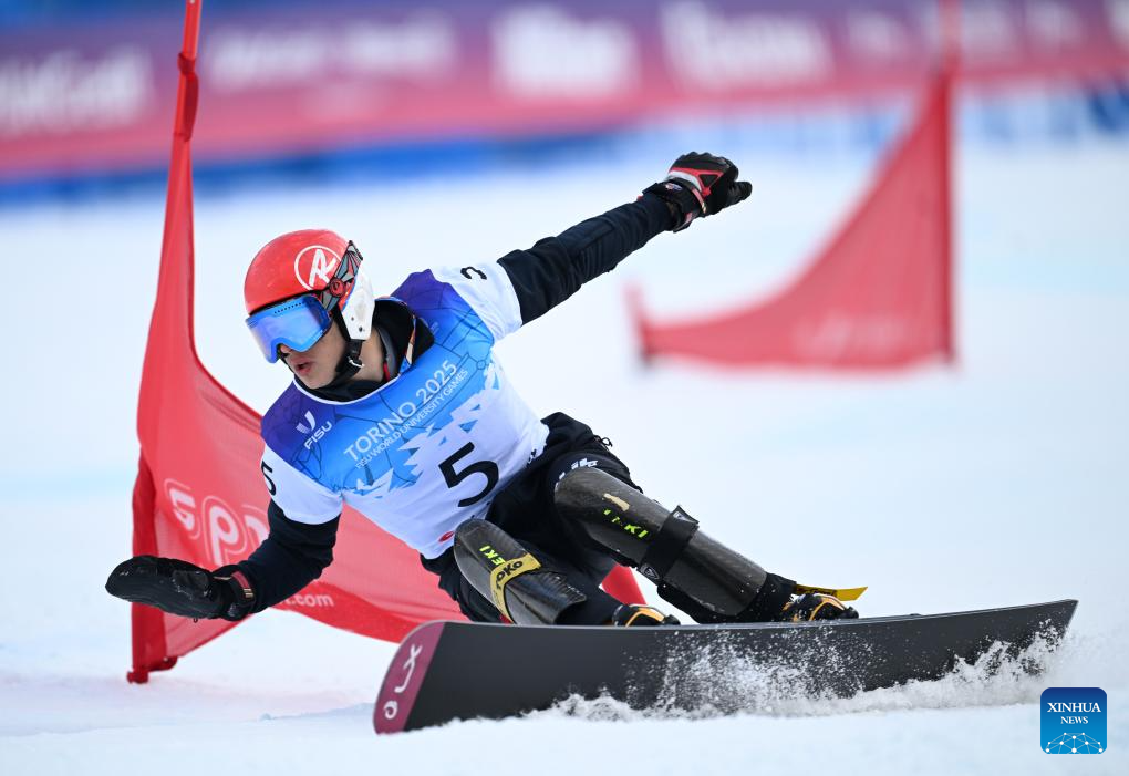 Li Yuang of China competes during the elimination run of the men's snowboard parallel giant slalom competition at the 2025 FISU Winter World University Games in Bardonecchia, Italy, Jan. 21, 2025. (Xinhua/He Canling)