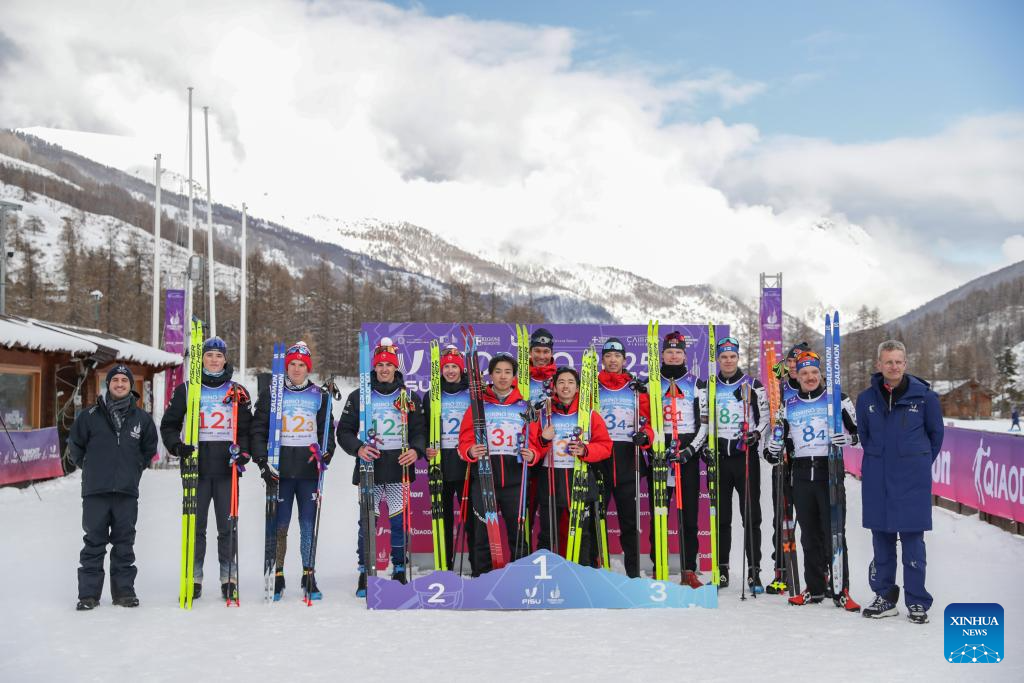 Lyu Wanyu (2nd L) of China competes during the mixed team relay semifinal at the 2025 FISU Winter World University Games in Turin, Italy, Jan. 21, 2025. (Xinhua/Li Jing)