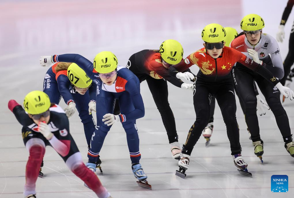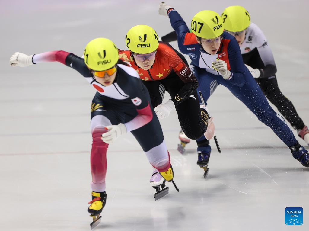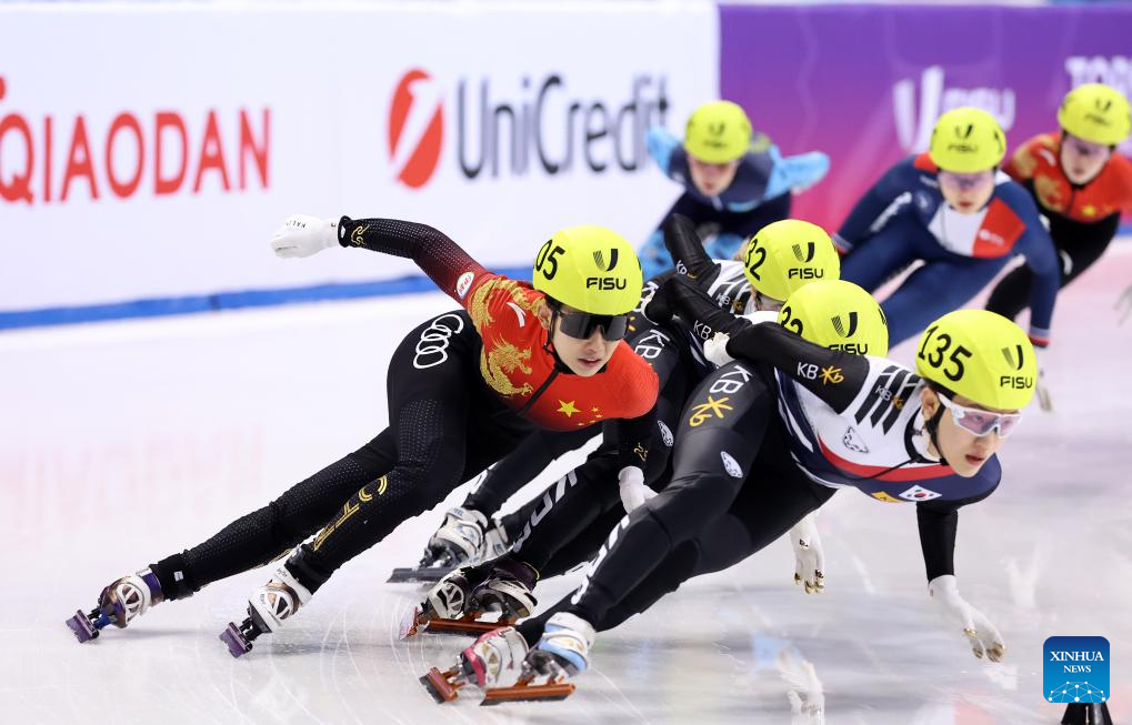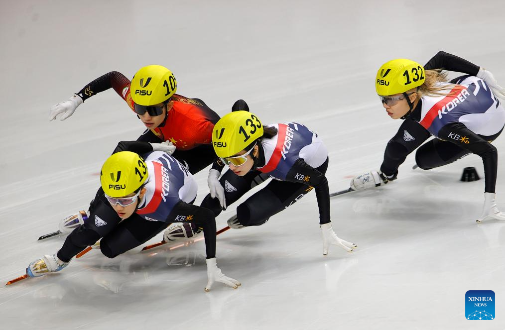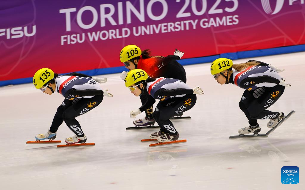 Kim Gilli (2nd R), Seo Whimin (1st L) and Kim Geonhee (1st R) of South Korea and Zhang Yan of China compete during the women's 1500m final A of the short track speed skating competition at the Torino 2025 FISU World University Winter Games in Turin, Italy, Jan. 21, 2025. (Xinhua/Ding Xu)