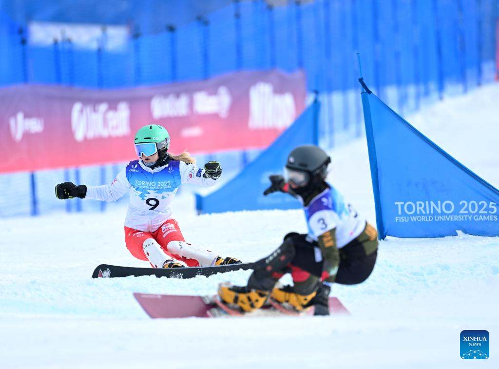 Sonia Zapala (L) of Poland and Kanazawa Noa of Japan compete during the small final of the women's snowboard parallel giant slalom competition at the 2025 FISU Winter World University Games in Bardonecchia, Italy, Jan. 21, 2025. (Xinhua/He Canling)