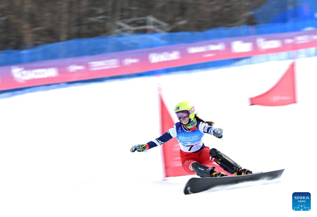 Eleonora Pavliuk of Ukraine competes during the round of 16 of the women's snowboard parallel giant slalom competition at the 2025 FISU Winter World University Games in Bardonecchia, Italy, Jan. 21, 2025. (Xinhua/He Canling)