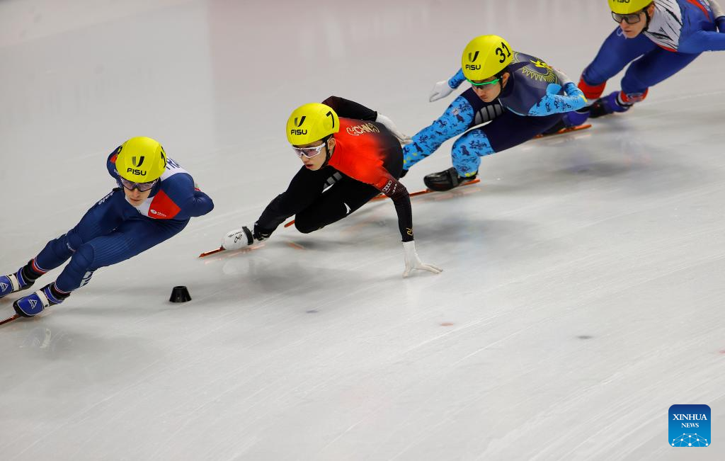 Zhu Yiding (1st R) of China competes during the men's 1500m final A of the short track speed skating competition at the Torino 2025 FISU World University Winter Games in Turin, Italy, Jan. 21, 2025. (Xinhua/Zhang Chen)