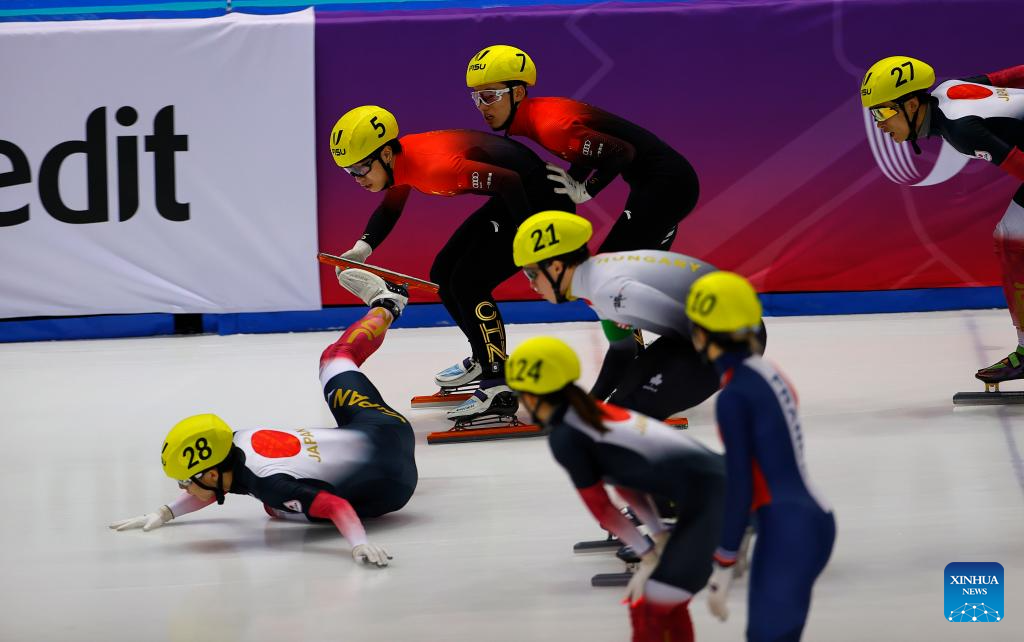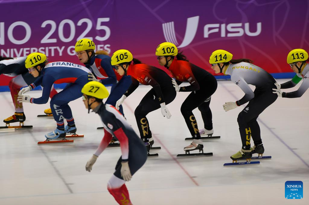 Skaters compete during the mixed team relay semifinal at the 2025 FISU Winter World University Games in Turin, Italy, Jan. 21, 2025. (Xinhua/Li Jing)