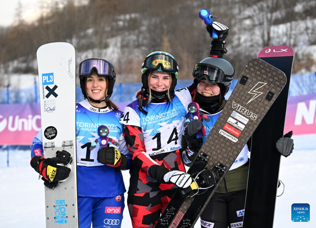 Gold medalist Carmen Kainz (C) of Austria, silver medalist Elisa Fava (L) of Italy, bronze medalist Kanazawa Noa of Japan pose for photos after the women's snowboard parallel giant slalom competition at the 2025 FISU Winter World University Games in Bardonecchia, Italy, Jan. 21, 2025. (Xinhua/He Canling)