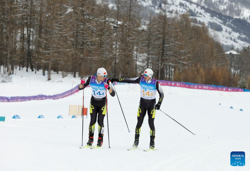 Song Guixu (L) of China competes during the mixed team relay semifinal at the 2025 FISU Winter World University Games in Turin, Italy, Jan. 21, 2025. (Xinhua/Li Jing)