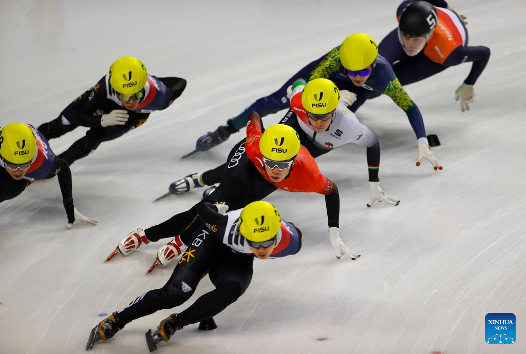 Zhu Yiding (4th R) of China competes during the men's 1500m final A of the short track speed skating competition at the Torino 2025 FISU World University Winter Games in Turin, Italy, Jan. 21, 2025. (Xinhua/Ding Xu)