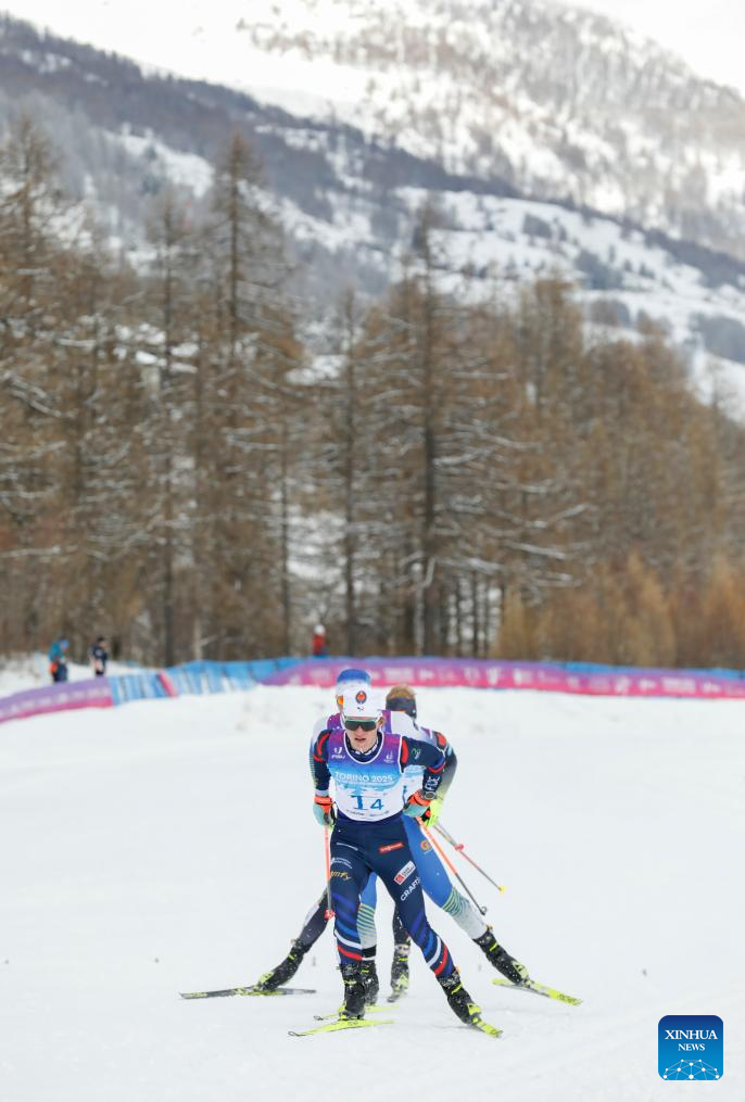 Felix Caillot (front) of France competes during the cross-country skiing men's 4x7.5km relay at the 2025 FISU Winter World University Games in Pragelato, Italy, Jan. 21, 2025. (Xinhua/Zhang Fan)