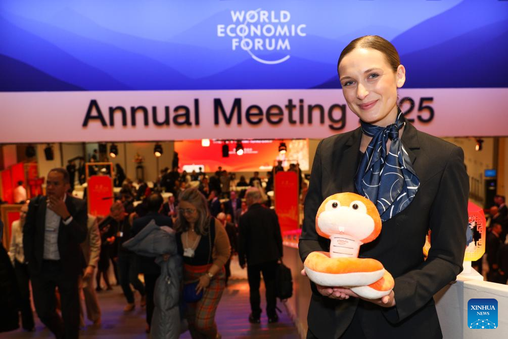 A staff member holds a plush toy snake at a reception held by Tianjin City of China during the World Economic Forum (WEF) Annual Meeting 2025 in Davos, Switzerland, Jan. 21, 2025. Tianjin, the host city of the 2025 Summer Davos (Annual Meeting of the New Champions), held the reception here on Tuesday evening to mark the upcoming Chinese Spring Festival, or the Chinese Lunar New Year. (Xinhua/Peng Ziyang)