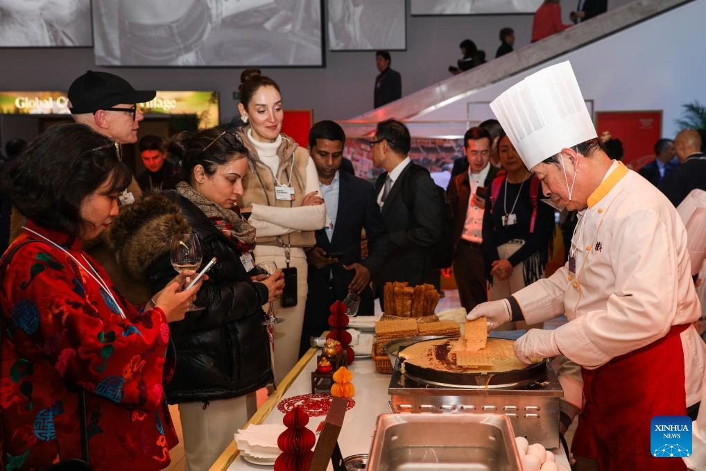 Participants try Tianjin crepe at a reception held by Tianjin City of China during the World Economic Forum (WEF) Annual Meeting 2025 in Davos, Switzerland, Jan. 21, 2025. Tianjin, the host city of the 2025 Summer Davos (Annual Meeting of the New Champions), held the reception here on Tuesday evening to mark the upcoming Chinese Spring Festival, or the Chinese Lunar New Year. (Xinhua/Peng Ziyang)