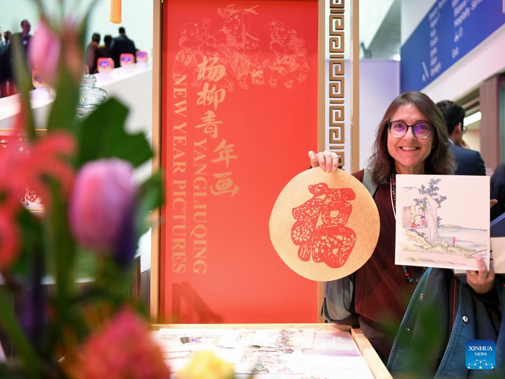 A participant shows Yangliuqing woodblock paintings at a reception held by Tianjin City of China during the World Economic Forum (WEF) Annual Meeting 2025 in Davos, Switzerland, Jan. 21, 2025. Tianjin, the host city of the 2025 Summer Davos (Annual Meeting of the New Champions), held the reception here on Tuesday evening to mark the upcoming Chinese Spring Festival, or the Chinese Lunar New Year. (Xinhua/Lian Yi)