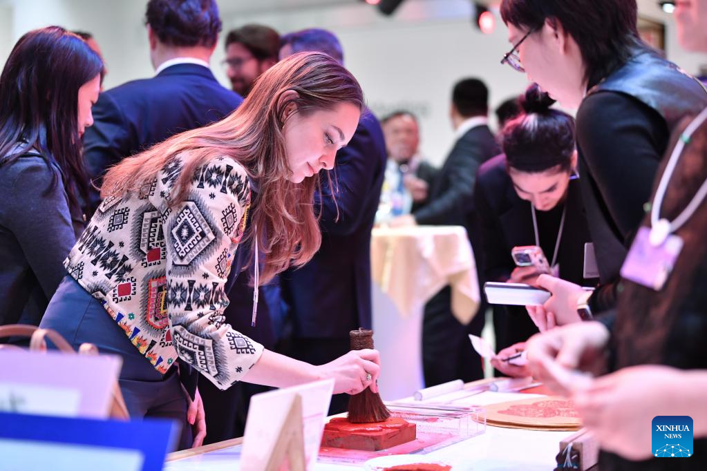 A participant tries to print Yangliuqing woodblock paintings at a reception held by Tianjin City of China during the World Economic Forum (WEF) Annual Meeting 2025 in Davos, Switzerland, Jan. 21, 2025. Tianjin, the host city of the 2025 Summer Davos (Annual Meeting of the New Champions), held the reception here on Tuesday evening to mark the upcoming Chinese Spring Festival, or the Chinese Lunar New Year. (Xinhua/Lian Yi)