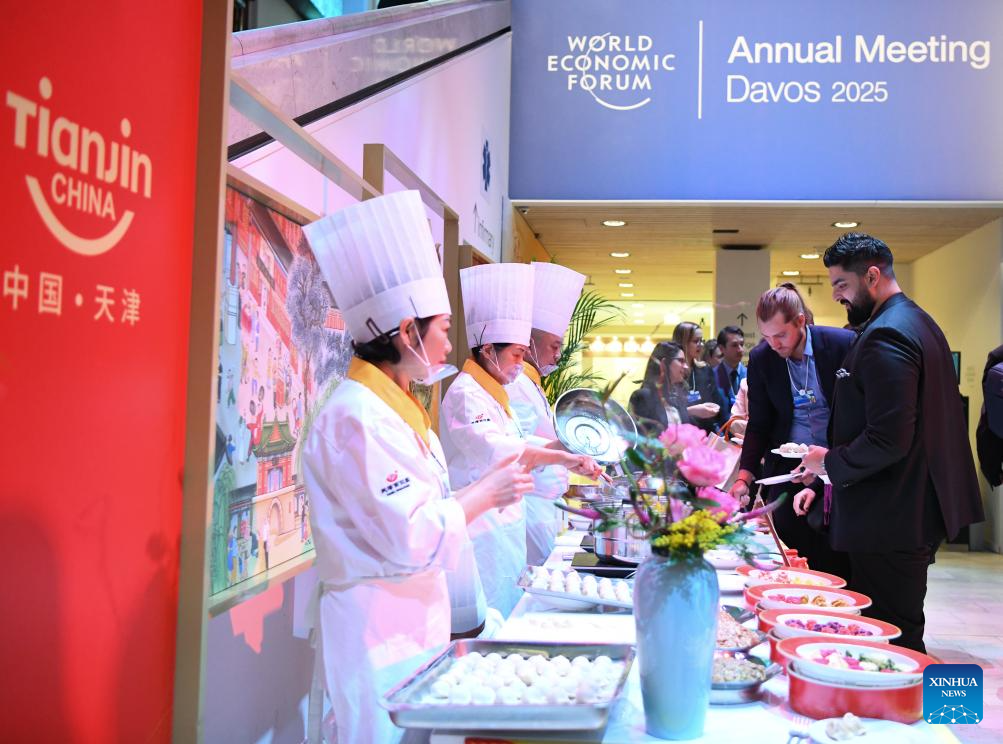 Participants try dumplings at a reception held by Tianjin City of China during the World Economic Forum (WEF) Annual Meeting 2025 in Davos, Switzerland, Jan. 21, 2025. Tianjin, the host city of the 2025 Summer Davos (Annual Meeting of the New Champions), held the reception here on Tuesday evening to mark the upcoming Chinese Spring Festival, or the Chinese Lunar New Year. (Xinhua/Lian Yi)