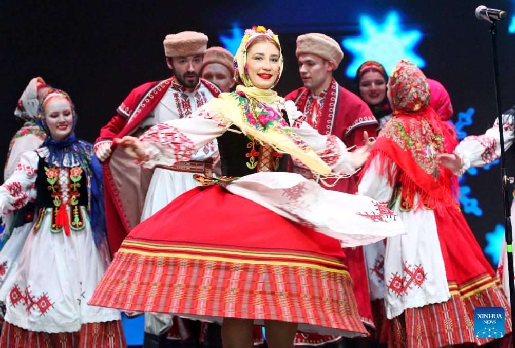 Belarusian students perform during a gala held to greet the upcoming Spring Festival, or Chinese New Year, in Minsk, Belarus, Jan. 20, 2025. (Photo by Henadz Zhinkov/Xinhua)
