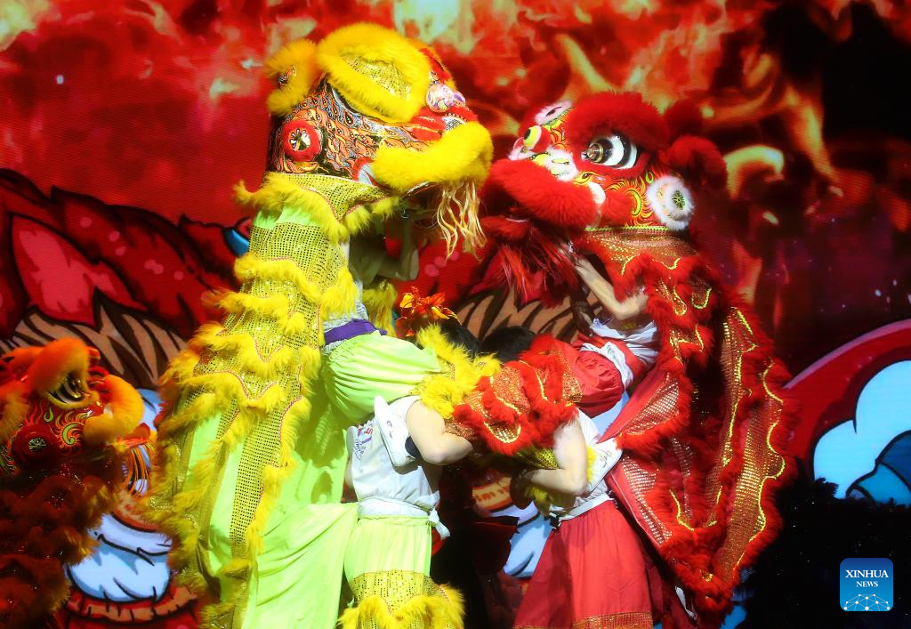 Chinese students perform lion dance during a gala held to greet the upcoming Spring Festival, or Chinese New Year, in Minsk, Belarus, Jan. 20, 2025. (Photo by Henadz Zhinkov/Xinhua)