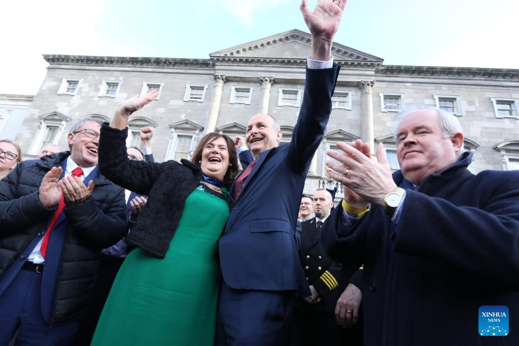 Fianna Fail leader Micheal Martin (4th L, front) is congratulated upon becoming the new Irish prime minister outside Leinster House, the Irish parliament building, in Dublin, Ireland, on Jan. 23, 2025. (The Houses of the Oireachtas/Handout via Xinhua)