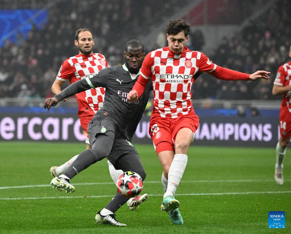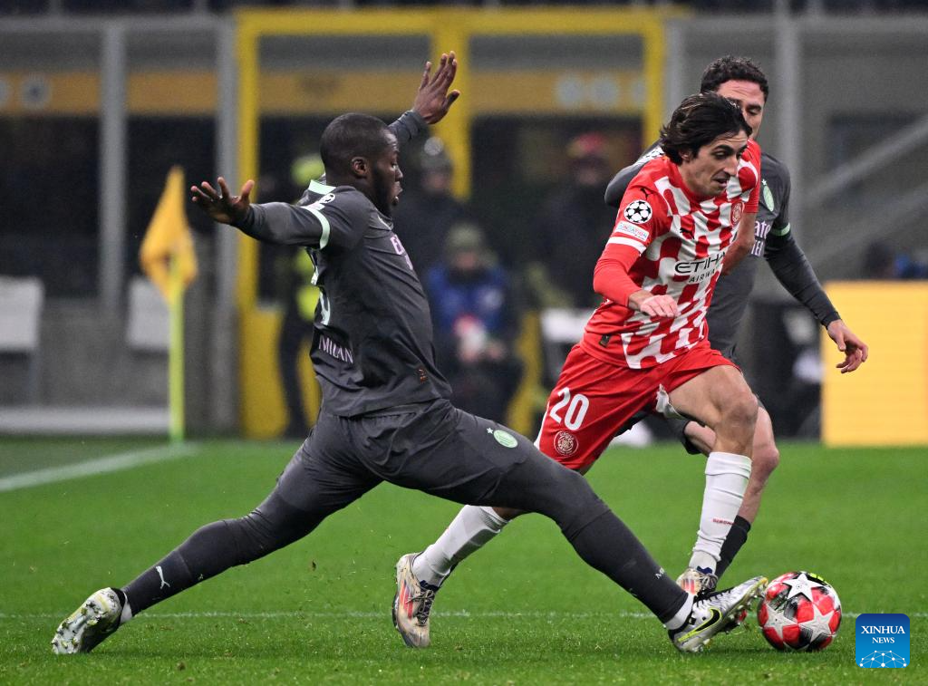 AC Milan's Yunus Musah (L) vies with Girona's Ladislav Krejci during the UEFA Champions League match between AC Milan and Girona in Milan, Italy, Jan. 22, 2025. (Photo by Alberto Lingria/Xinhua)