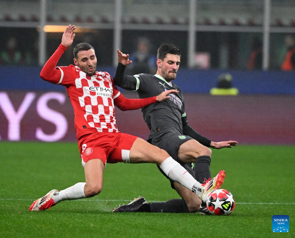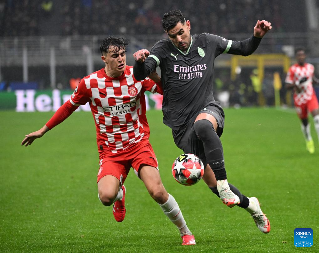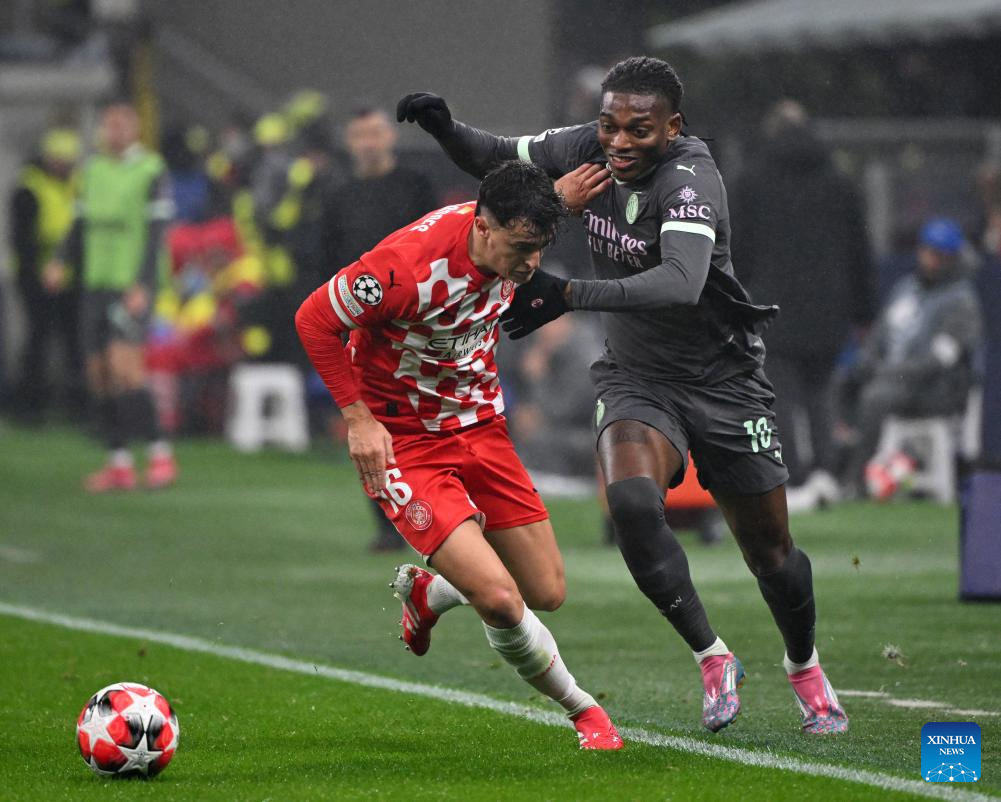 AC Milan's Rafael Leao (R) vies with Girona's Alejandro Frances during the UEFA Champions League match between AC Milan and Girona in Milan, Italy, Jan. 22, 2025. (Photo by Alberto Lingria/Xinhua)